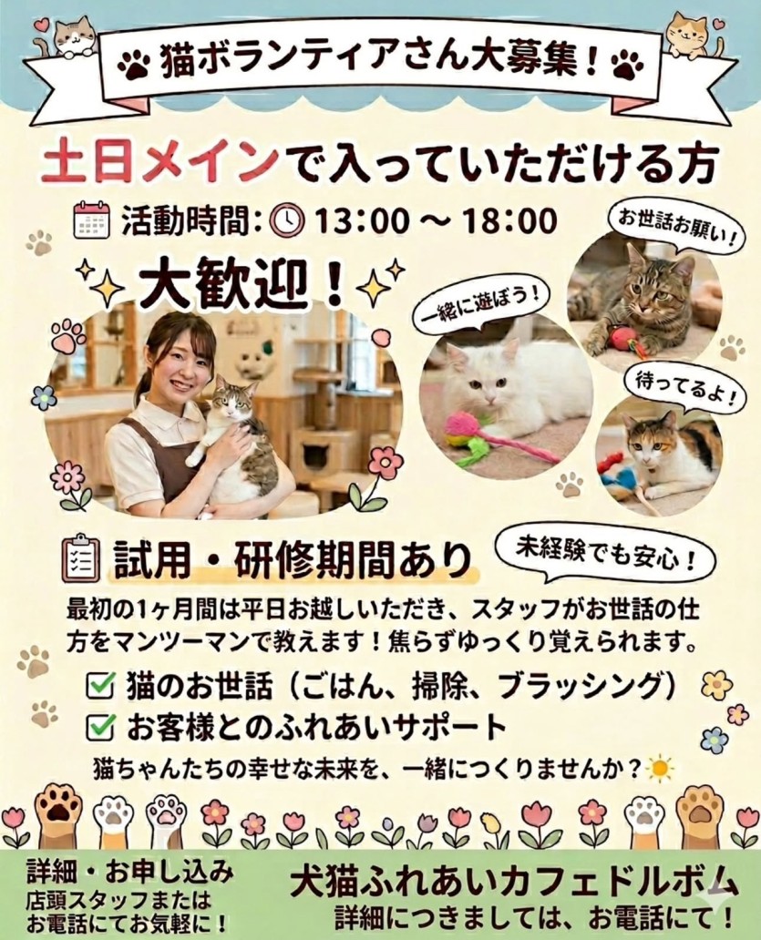 ・内容: 猫ちゃんのお世話(掃除・ごはん・ブラッシング)、お客様とのふれあいサポート。